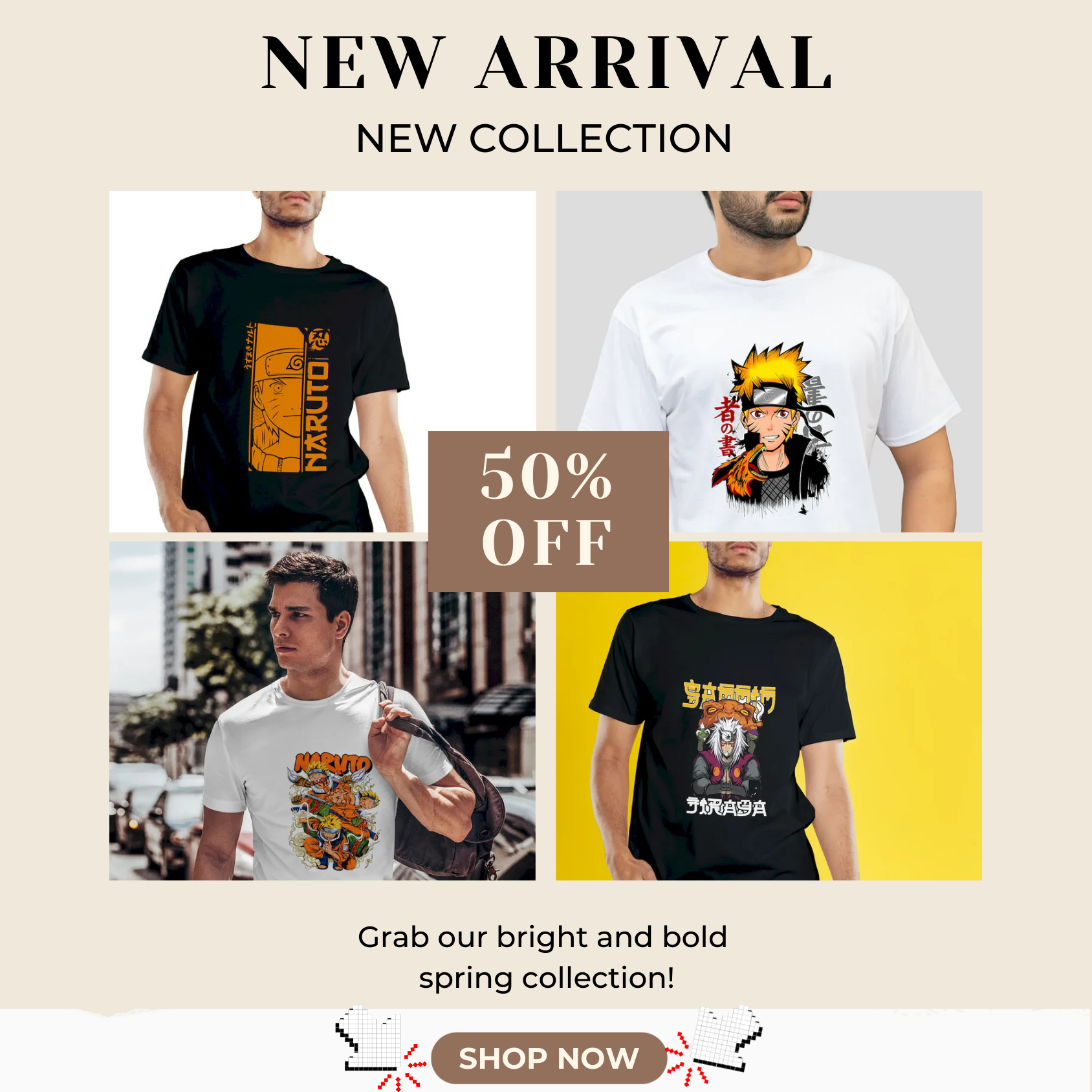 - Uzumaki Naruto Print – Classic orange jumpsuit, Rasengan pose.